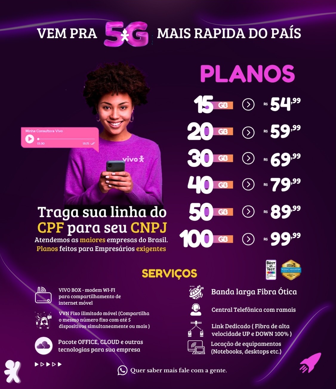 Conectividade Ininterrupta: Os planos da Vivo garantem que sua empresa esteja sempre online, aumentando a produtividade.